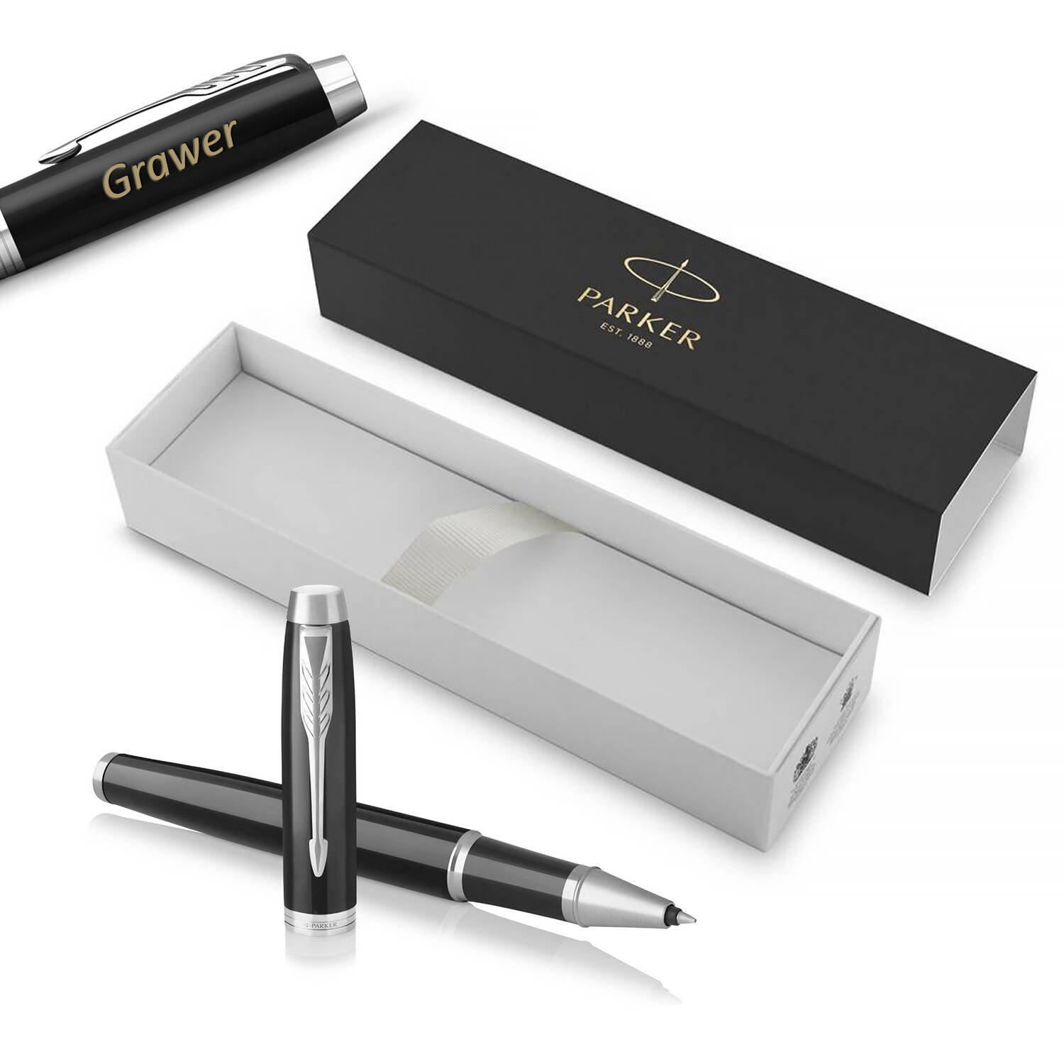 Błyszczący czarny lakier i chromowane pierścienie. W opakowaniu prezentowym Parker.