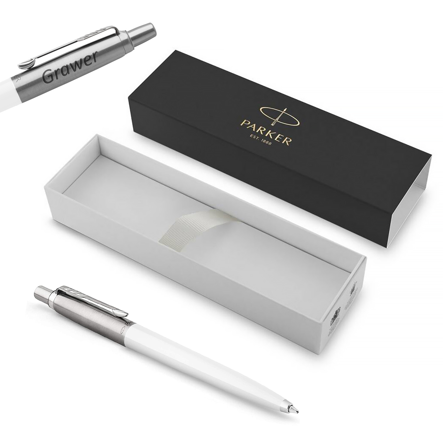 Korpus długopisu Parker Jotter Originals White CT wykonano z odpornego na zarysowania plastiku w kolorze białym, część górną oraz wykończenia ze stali nierdzewnej. Długopis posiada mechanizm przyciskowy wysuwania wkładu.
