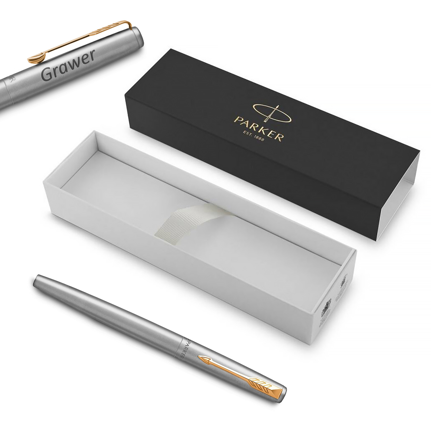 - Pióro wieczne Parker Jotter Stalowy GT wykonane zostało ze stali nierdzewnej. Jego korpus to szlifowana stal szlachetna. Zarówno skuwka jak i klip wykonane zostały z polerowanej stali nierdzewnej ze złotymi wykończeniami. Część przednia pióra to czarne tworzywo sztuczne, stalówka wykonana jest ze stali, grubość pisania M (medium).