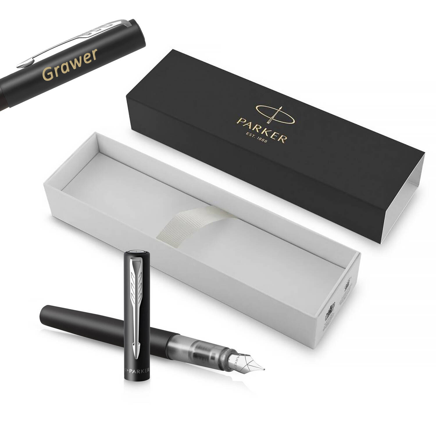 Metaliczne wykończenie w satynowym czarnym kolorze uzupełnione jest chromowanymi wykończeniami i charakterystycznym klipsem w kształcie strzałki PARKER. Posiada niepowtarzalny, przezroczysty korpus odsłaniający mechanizm wewnętrzny pióra. Duża, trwała stalówka ze stali szlachetnej zapewnia wygodne i płynne pisanie.