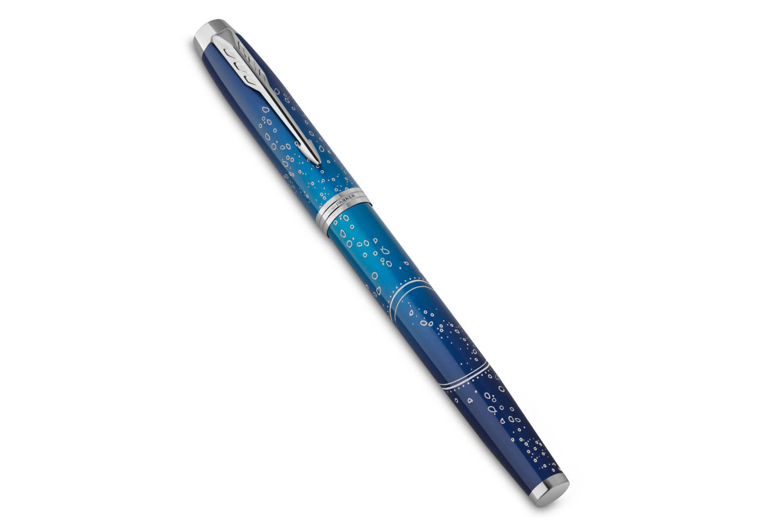 Nasadka pokryta cieniowanym lakierem w kolorze niebieskim i korpus ozdobiony wyczuwalnym grawerowanym wzorem inspirowanym eksploracją morskich głębin. Całość uzupełniają chromowane wykończenia i charakterystyczny klips w kształcie strzałki PARKER.