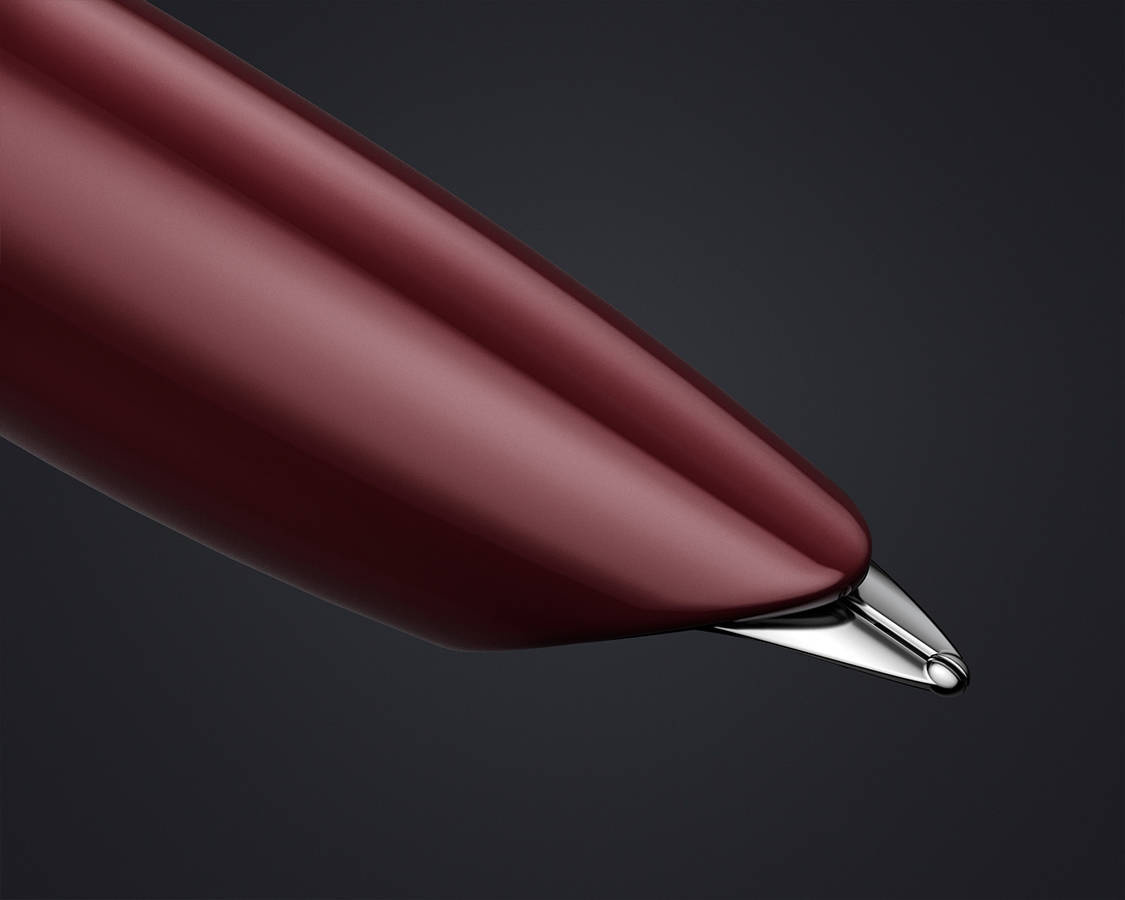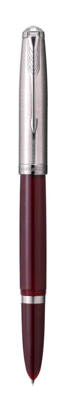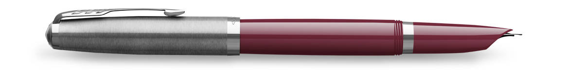 Burgundowy Parker 51 z chromowanymi wykończeniami to opływowa sylwetka i ikoniczna, zabudowana stalówka. Ręcznie składany z zastosowaniem drogocennej, burgundowej żywicy, dopełniony nasadką ze stali szlachetnej oraz koroną nasadki i pierścieniami powlekanymi palladem.