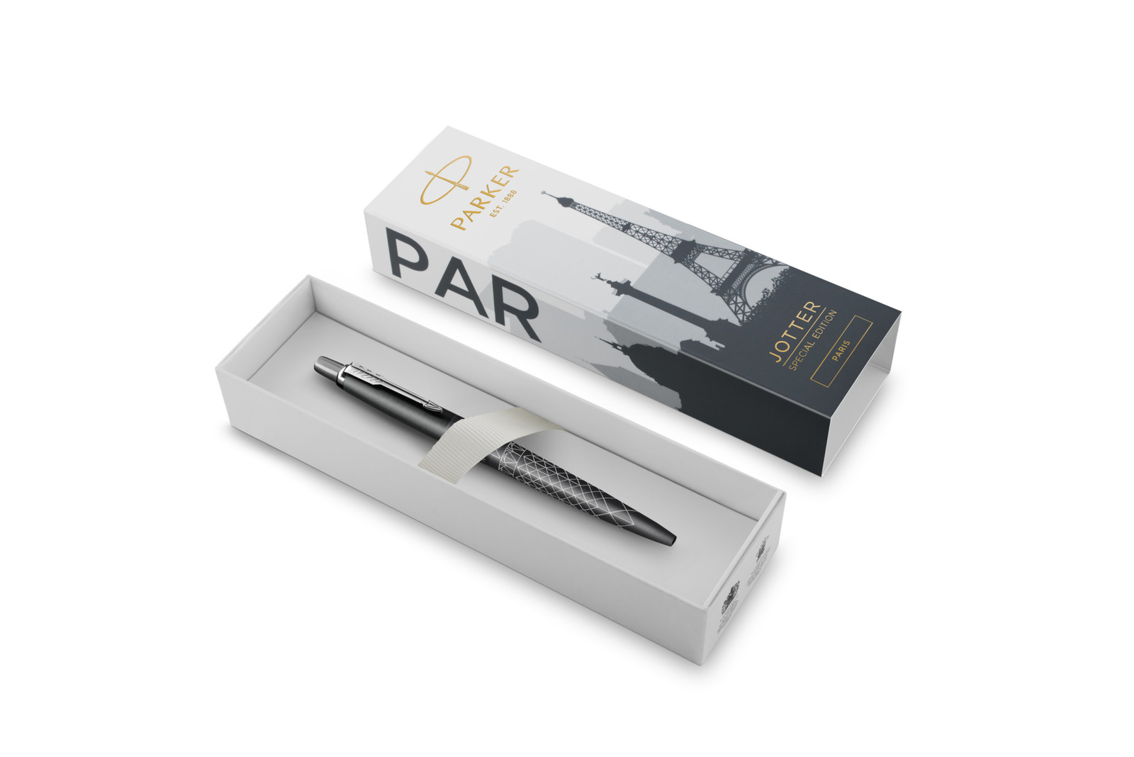 Jotter w edycji specjalnej kolekcji „Global Icons” to rezultat ostatniej, wielkiej wyprawy po metropoliach świata, która tym razem zawitała do czterech fascynujących destynacji. Za inspirację dla Jotter w edycji specjalnej Paris posłużyły zapierająca dech w piersiach panorama i urzekająca atmosfera Miasta Świateł. Ponadczasowe piękno eleganckich odcieni paryskiej architektury, misterne wzory zdobiące historyczne i współczesne pomniki znajdują odzwierciedlenie w poszczególnych elementach długopisu. To wyjątkowe wzornictwo zostało starannie naniesione laserem na korpusie tego wspaniałego artykułu piśmienniczego, będącego dowodem kunsztu rzemieślniczego Parker. Jego dopełnienie stanowią gładkie pismo i charakterystyczne kliknięcie długopisu Jotter wykończonego lakierem w kolorze szarości. Jotter w edycji specjalnej Paris zabierze osobę wkraczającą w świat luksusowego pisania w niezapomnianą podróż.